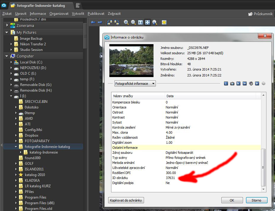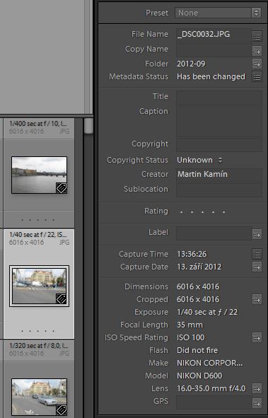 Proto jsem se zaměřil na JPG, které zrcadlovka vyrábí přímo při fotografování. Podíval jsem se do databáze mého Lightroomu, kde mám 150 000 fotek a hledal jsem v Metadatech nějaké informace, které b ymi pomohly. Ale ani Zoner, ani Lightroom neukazují - ona totiž v JPG je uložená, ale tyhle nástroje ji prostě neukazují.