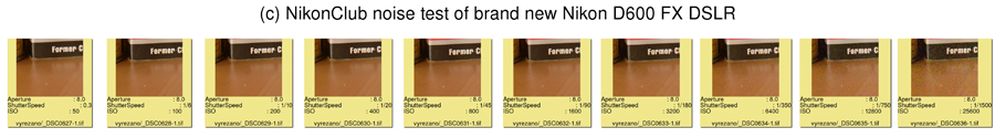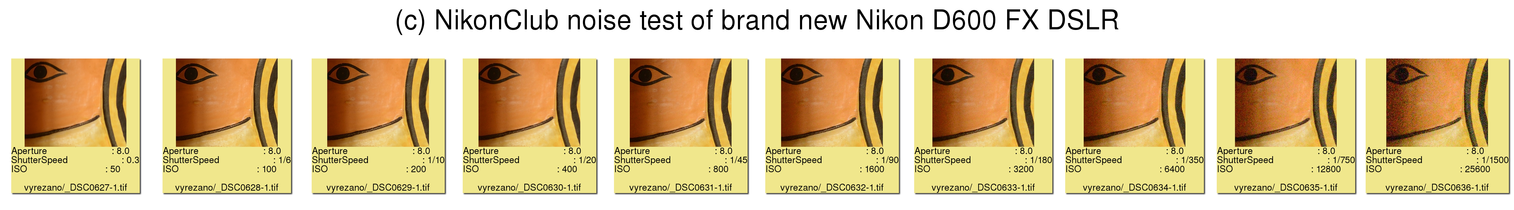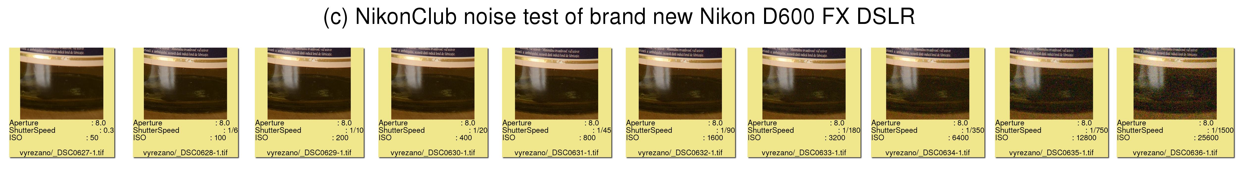Nyní výsledky, pro jednotlivé expoziční hodnoty od ISO 50, přes 100, 200, 400, 800, 1600, 3200, 6400, 12800 až 25600.