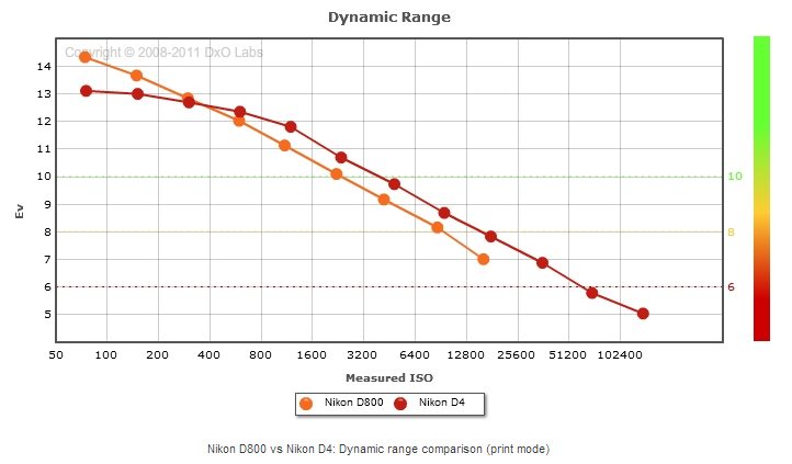 Plného dynamického rozsahu ve 14bitové hloubce dosahuje Nikon D800 do ISO 400 a také lepších hodnot než Nikon D4. Při vyšších hodnotách citlivosti už ale klesá rychleji, a například pro ISO 1600 už dosahuje jen 10,5 EV, což je mimochodem na úrovni Nikon 1 J1.