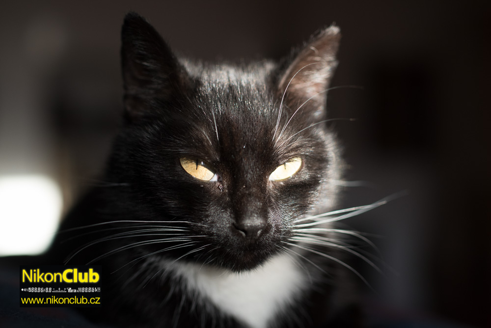 Stáhnout zdrojový NEF | Kočka v přirozeném zapadajícím světle, clonil jsem na f/2.4, aby to alespoň mělo nějakou hloubku, na FX tele jsou hloubky ostrosti tak malé, že člověk musí opravdu pečlivě vybírat, kam ostří. Stávalo se mi u těchto fotografií, že jsem zaostřil na čumák, a oči byly neostré. |