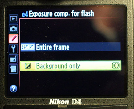 - takže oproti článku, nová funkce je ve fotoaparátech D4 a D600 standardně VYPNUTÁ! - je nastaveno "Entire frame" (výchozí nastavení) tzn. použití kompenzace expozice na fotoaparátu upraví expozici snímku (clona, čas, iso) a zároveň upraví intenzitu blesku.