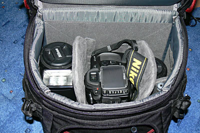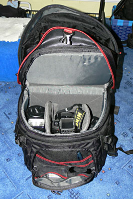 Úplně v pohodě litrovou termosku nebo 1,5l lahev tam dáte, k tomu i několik řízků, bundu, prostě cokoliv. Je tam i spousta síťovaných kapes na drobnosti nebo třeba doklady, a nebo i další drobné věci k foťáku. Zepředu jsou také dvě kapsy, ve vrchní nosím mapy, sušenky atd, ve spodní dálkovou spoušť, balonek, držák filtrů, manuál, atd... Někde jsem četl, že si uživatelé občas stěžují na propadávání věcí z horní do dolní komory. Je pravda, že jsou okolo přepážky drobné mezírky, ale když se nahoře nebude nosit zrní, tak bych se toho nebál.