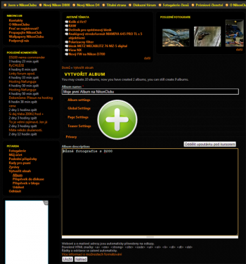 - Musíte vyplnit dvě základní informace Album name a Album description, Album si nazvěte – Album name – například: "Moje první Album na NikonClubu", Album popište detailně - Album description – "Různé fotografie s D200"