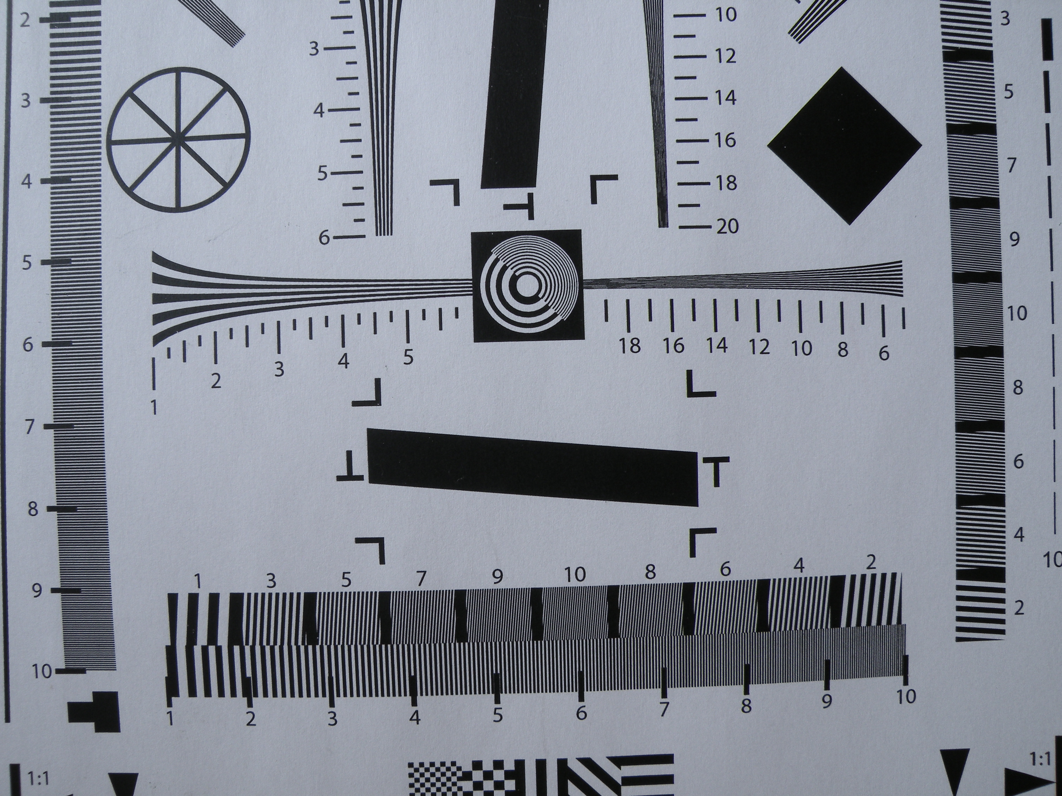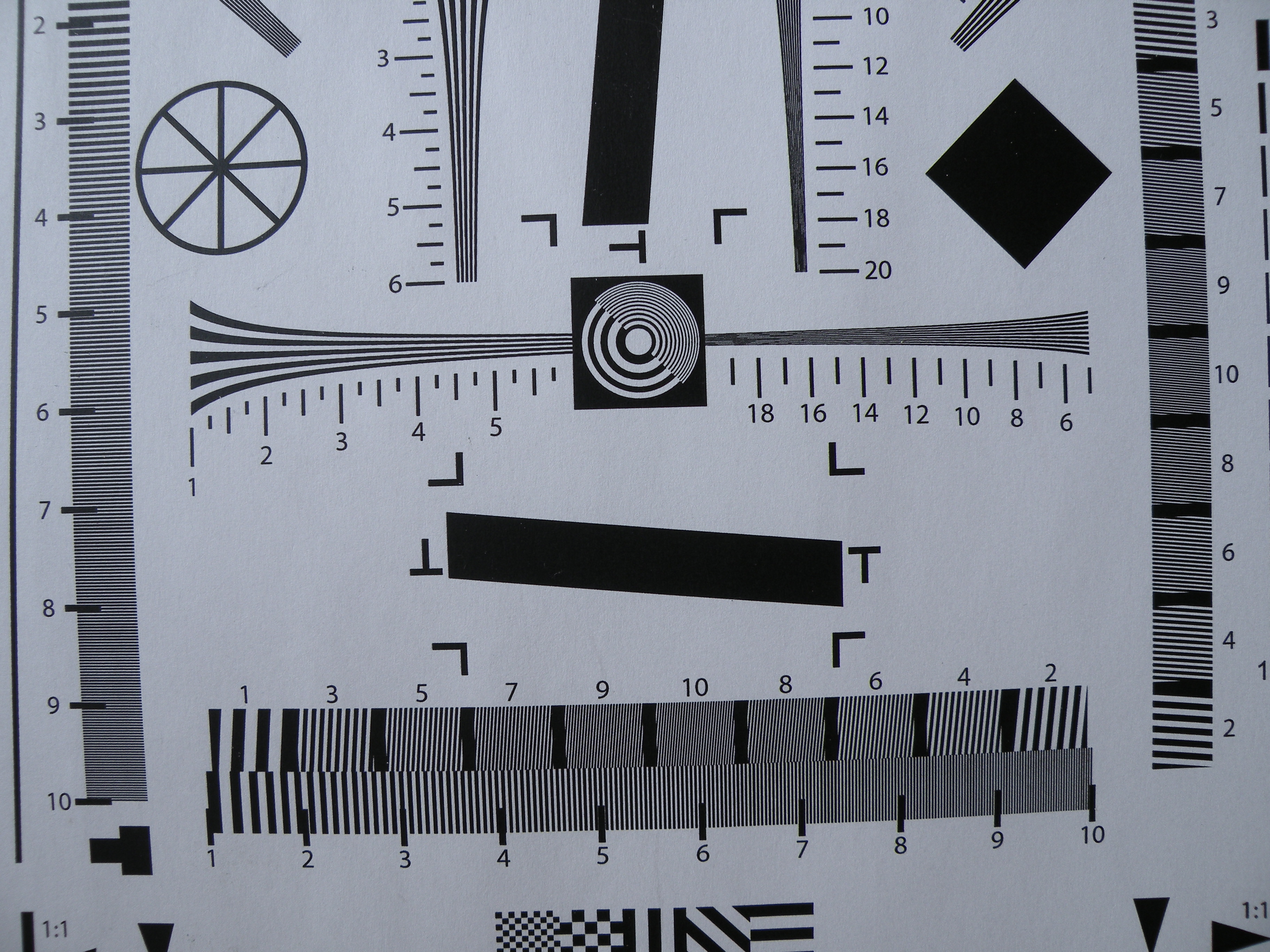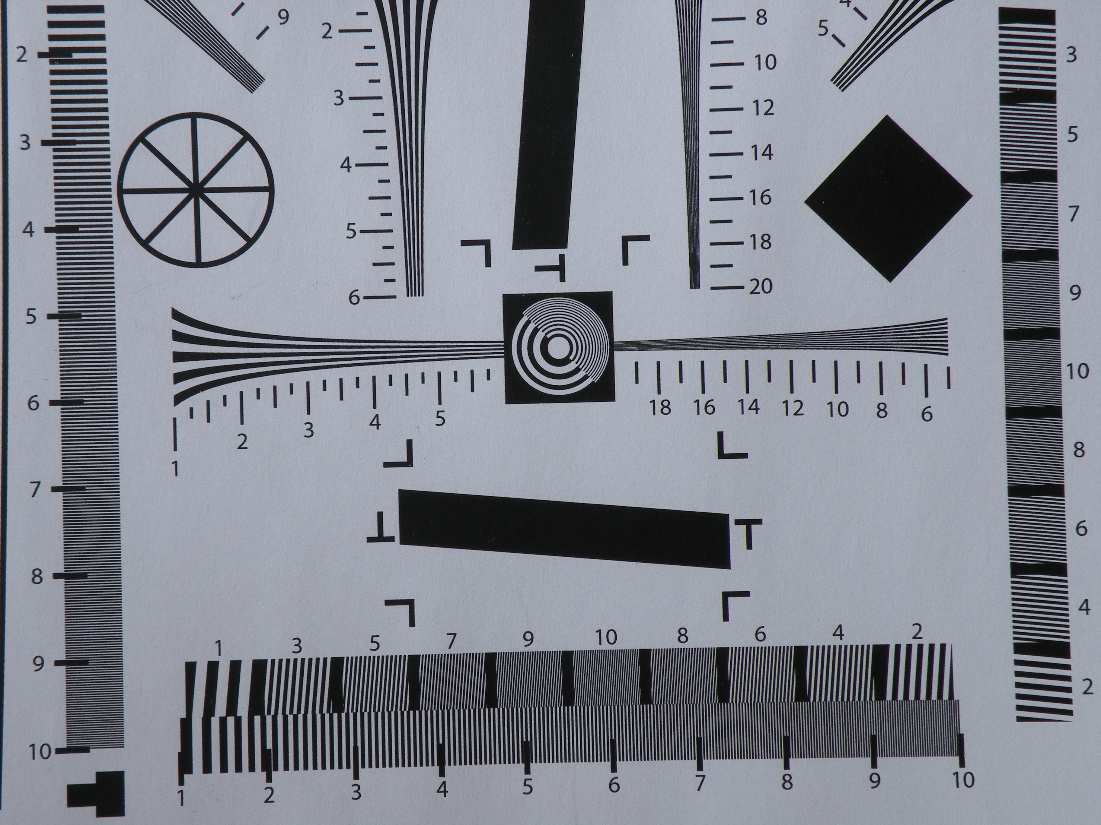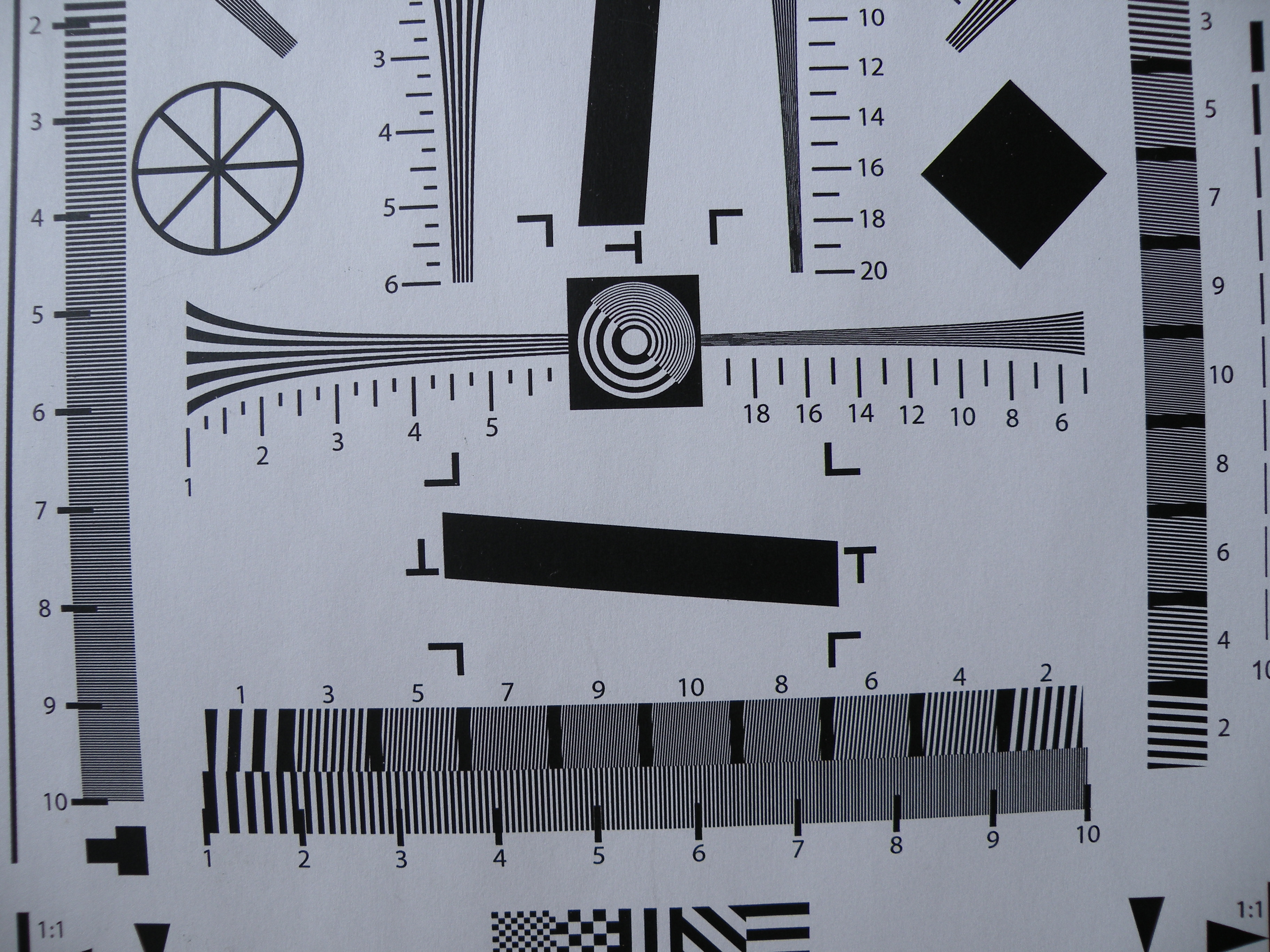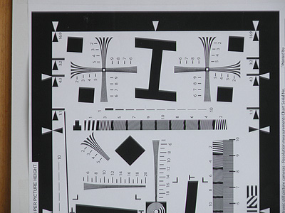 Pozor! Testovací obrazec není vytištěn v měřítku, takže nelze ze snímků odčítet údaje o rozlišení snímače a objektivu!