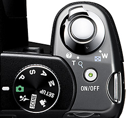 Rozmístění jednotlivých ovládacích prvků je přirozené – jsou snadno přístupné i během focení pomocí hledáčku. Ten je elektronický, což znamená, že je v něm promítán obraz snímané scény pomocí malého TFT LCD. Hledáček nabízí rozlišení přibližně 235 tisíc bodů, zobrazení je tedy poměrně jemné a umožní i ruční ostření. Displej (s úhlopříčkou 2,7“) na zadní straně fotoaparátu nabízí stejné rozlišení jako hledáček. Vykreslování scény je dostatečně rychlé a plynulé.