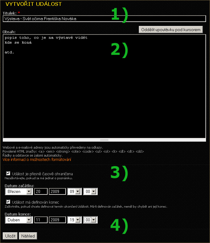 Každá událost samozřejmě musí obsahovat výstižný Titulek 1) a vlastní popis Obsahu 2). Do něj pokud možno uveďte veškeré informace, které bude potenciální zájemce potřebovat - tedy především o čem událost pojednává, kde se odehrává, jak se dá na místo jejího konání dostat atp.