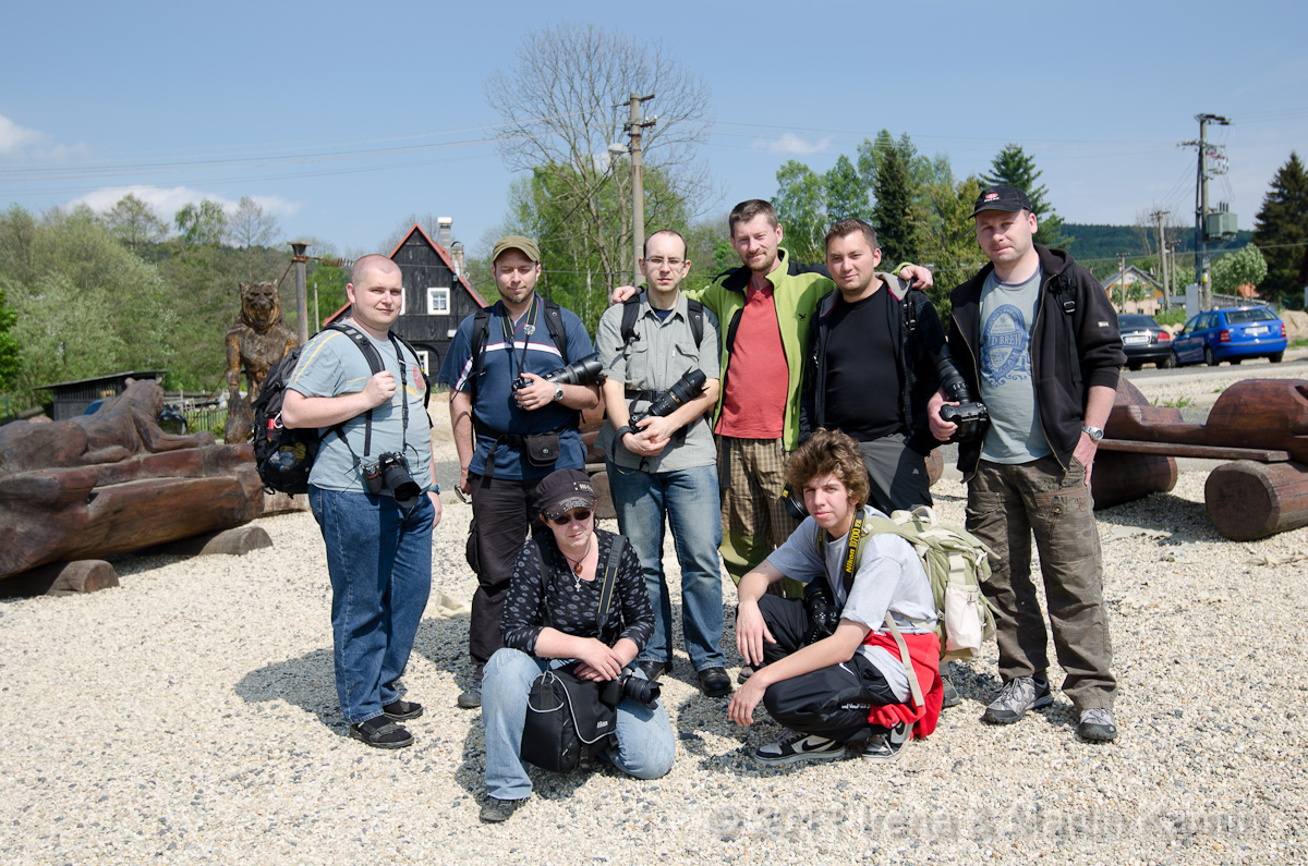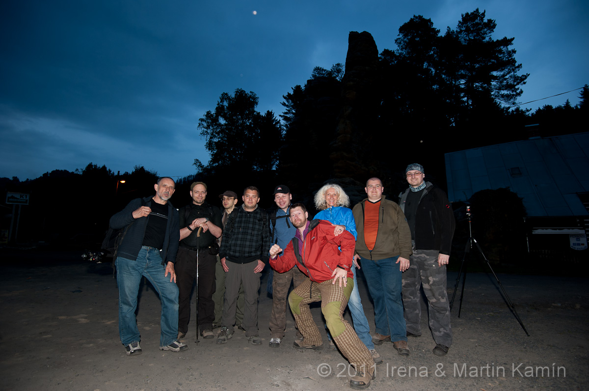 Nakonec se pod oběma masivy konala blesková blesková přestřelka. Nepodařilo se jí sice změřit rychlost světla, ale ověřili jsme si, že záblesk z běžné SB-800 dokážeme hravě spatřit na vzdálenost 1,2 km. Odtud také pochází naše další skupinová fotografie. Členové fotoexpedice se pak vrátili zpět do Fabriky, aby se dospali a připravili na nedělní už méně nabitý program.