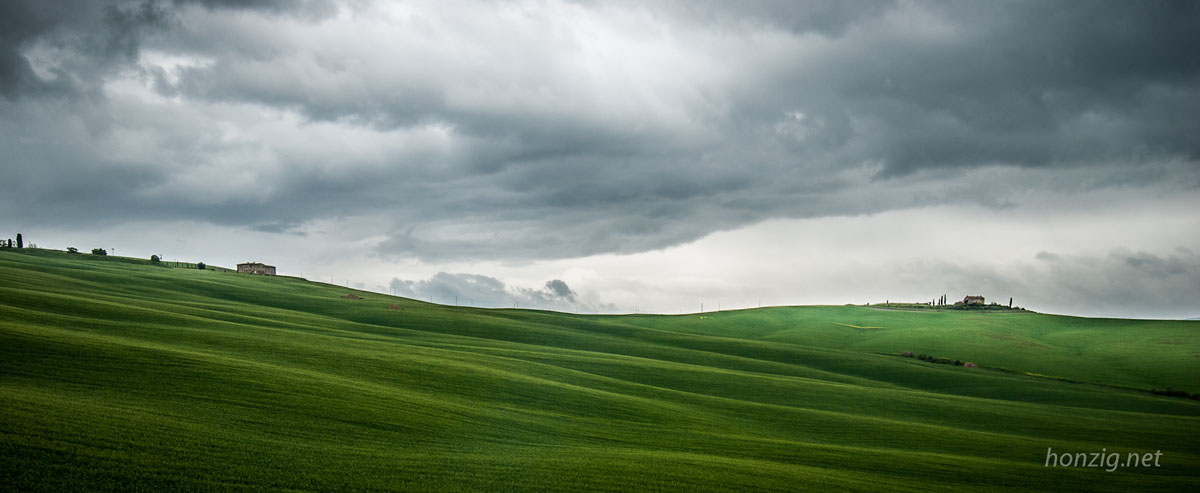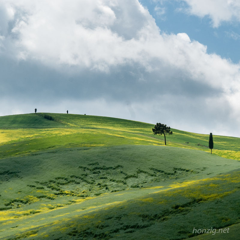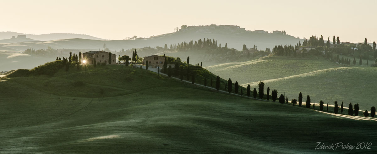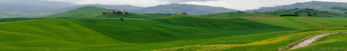 Focení krajiny v Toskánsku říkám: "jedno velké kompoziční cvičení". Každý krok venku vám otevře nové výhledy, támhle vyleze cypřišový trs, najednou se objeví mraky, vítr rozhrne chomáče obilí, prostě pastva pro oči a fotografa. Není možné se nedat strhnout. Naštěstí jsme hodně pány našeho času a všichni máme jeden cíl, takže když je potřeba zdržíme se v lokalitách o něco déle nebo se přesuneme jinam, kde víme, že to bude světelně lepší.
