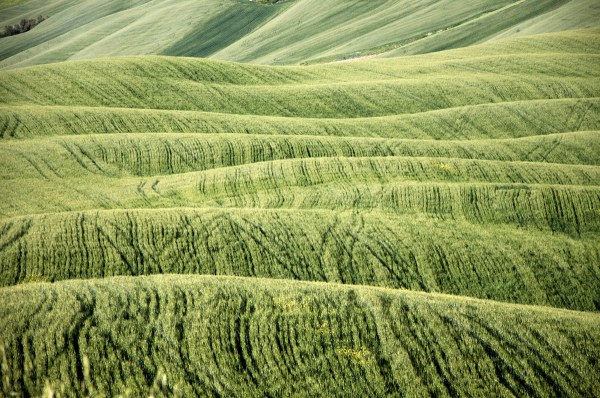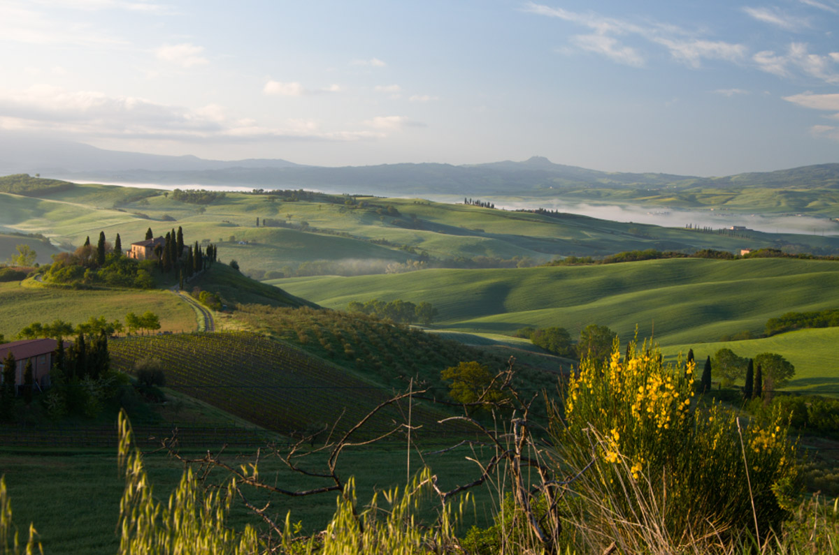 Zvlněná pole a pastviny, rozvíjející se mladé listy vinné révy, červené vlčí máky a žluté květy řepky prosazující se ve všudepřítomné jarní zeleni, to je romantický kraj Sienské provincie Toskánka.