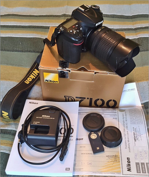 Prodám foto Nikon D7100 s objektivem Nikon AF-S NIKKOR DX 18-105mm f/3.5-5.6G ED VR v zcela funkčním stavu, jako nový, 1.majitel koupen v Megapixelu, nabiječka, sluneční clona, UV filtr, krytky, SD karta(16GB,UHS-I), dálk.spoušť, stativ Hama... Důvodem je přechod na full-frame.