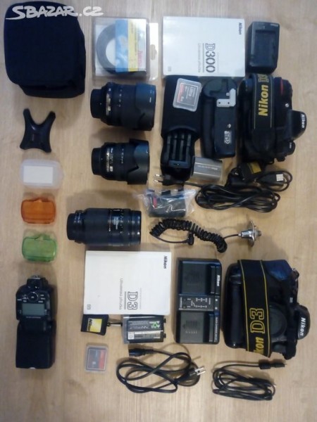 - Tělo D300 (55.400 expozic), manuál, očnice, popruh, 2x aku EN-EL3 - obě Nikon + nabíječka + kabel, USB kabel, 3 nové náhradní gumové polepy (bez zadního - na palec) náhradní krytka konektoru a kryt aku., CF karty 2x 8GB, kryt LCD, krytka sáněk blesku, hadřík na optiku