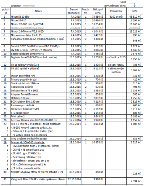 Z důvodu ukončení živnosti rozprodávám vybavení domácího fotoateliéru, fotoaparátu D810, objektivů Nikkor a další příslušenství. Vše ve velmi dobré stavu, málo používané. Nákup v roce 2014 až 2015, prodávám za 60% nákupních cen. Seznam včetně cen jsem uložil do png a nahrál sem jako obrázek. Proto uvádím cenu za zboží 0 Kč.