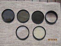Popis zleva doprava: 1) B+W C-POL+KR WARMTON , 2) HOYA CIR-PL HD slim, 3) HOYA PRO 1 Digital MC NDX4 , 4) B+W FARBVERLAUF GRAU 25% , 5) Carl Zeiss SOFTAR 1 , 6) B+W FOG 2, Kdo se vážně zabývá fotografováním tak asi ví k čemu tyto filtry slouží, malé připomenutí : č. 3 umožňuje použít malý čas závěrky, umožňuje zaznamenat pohyb aut, vody a zmenšení hloubky ostrosti , č. 4 funguje podobně je otočný v šedé části snižuje expozici o dvě clony, vyrovnává tak kontrasty např. mezi oblohou a zemí apod.