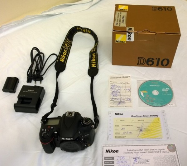 Prodám Nikon D610 s jednou náhradní baterií EN-EL15. Foťák má nafoceno jen asi 700 snímků. Je bez jakéhokoliv poškození a je ve stavu nového kusu. Byl zakoupen 21.11.2013 a je tedy ještě v záruce. Samozřejmostí je kompletní balení včetně návodů a dalšího originálního příslušenství