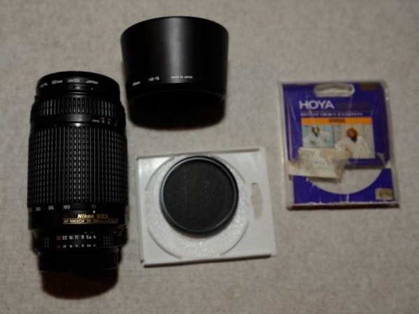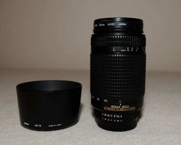 Prodám použitý objektiv AF Nikkor 70-300mm f4-5,6 D. Objektiv je včetně krytek, sluneční clony HB-15, UV filtru Hoy 62mm a CPL filtru Hoy 62mm. Objektiv použitý bez známek poškození a to i skla.