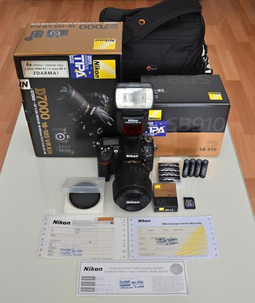 Prodám Nikon D7000 + 18-105mm VR + nasazený slim UV filtr (cca 6000foto),externí blesk Nikon SB910 (cca 500fotek),8ks baterie AA Ni-Mh Sanyo Eneloop 2400mAh do blesku,infra dálkové ovládání Nikon ML-L3,polarizační filtr B+W Käsemann MRC 67mm,paměťová karta LEXAR PRO 32GB,brašna Lowepro Nova 180AW.Kupováno 21.9.2012 v Nikon prodejně v HK.Kompletní balení vč.poukazu na 4x čištění snímače a daňových dokladů o koupi.Prodám pouze jako komplet.Vše je ve stavu 1A bez sebemenšího poškození a v pokračující záruce do 21.9.2014.