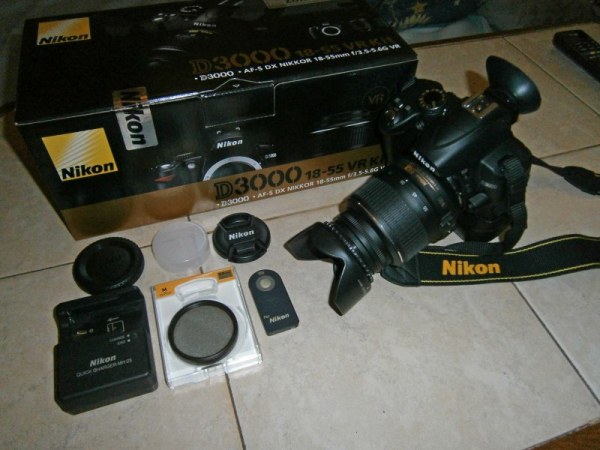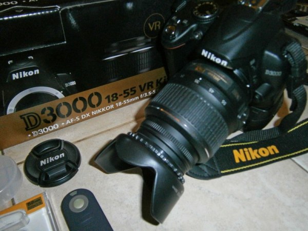 Prodám Nikon D3000 - nový (koupen listopad 2012)s objektivem 18-55mm AF-S DX Nikkor f/3.5-5.6 G VR + 4x čištění (2000Kč) a zdarma přidám baterry grip, 2x baterie, sluneční clona, dálk. ovládání (infra), UV filtr, polarizační filtr, brašna Nikon, profi očnice, karta 8Mb (v hodnotě 3000Kč). Nový s kompletním přísl. a záručními listy, návody, cd, krabice atd.