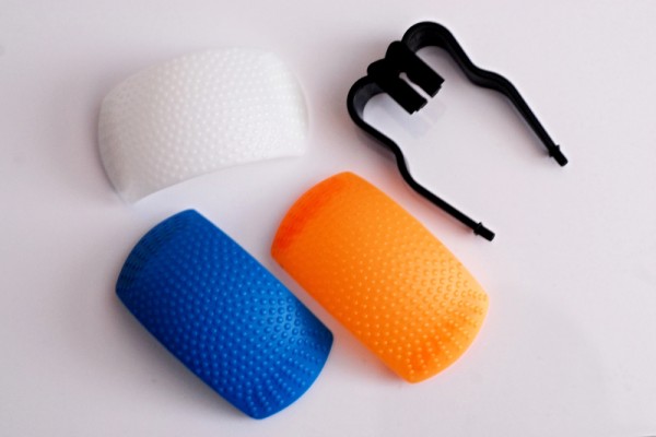 Barvy jsou bílá, oranžová a modrá. Součástí sady je černý držák, který se nasune do sáněk blesku.